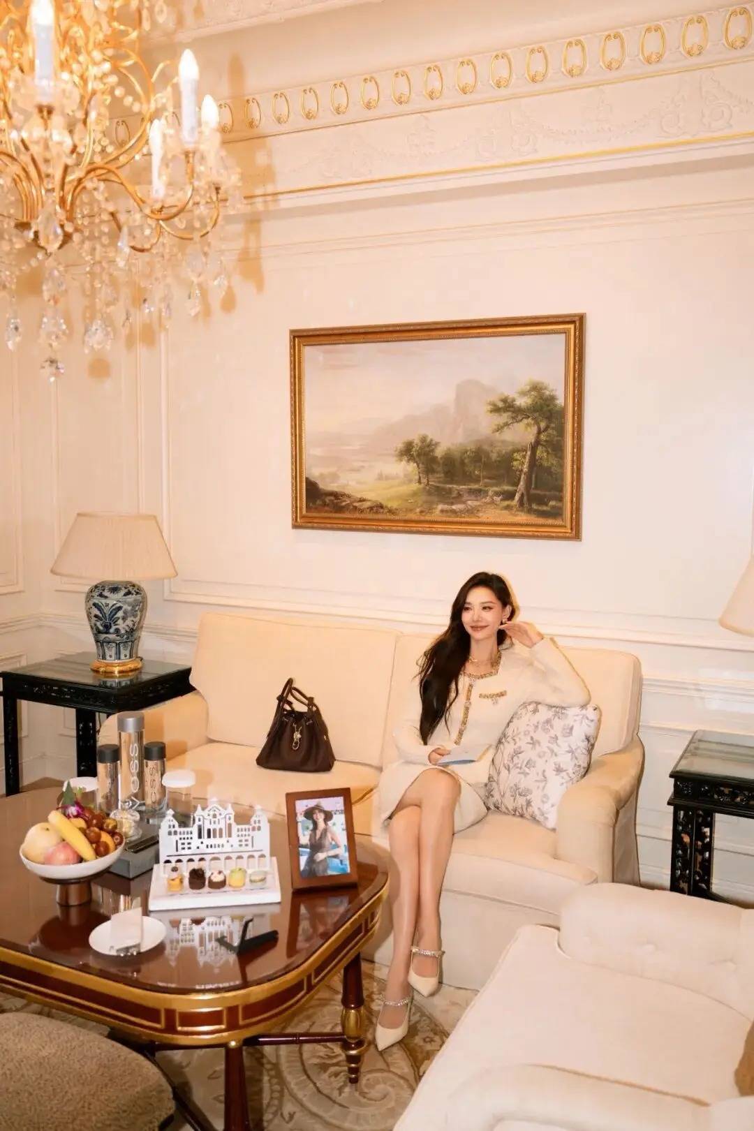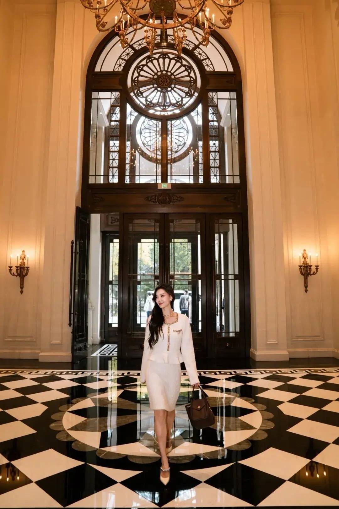 人物自然迈步,一手轻拎包袋,动态姿态消解了摆拍的僵硬感,还衬出穿搭的优雅线条。身体微侧,长发随步伐轻动的细节让画面更灵动,神态是舒展的笑意,不用刻意凹造型,把日常的松弛精致揉进动作里,借华丽空间的氛围,轻松拍出有格调的轻奢质感