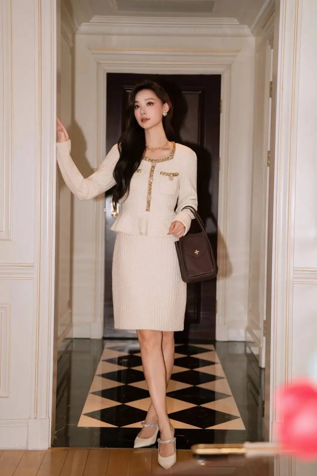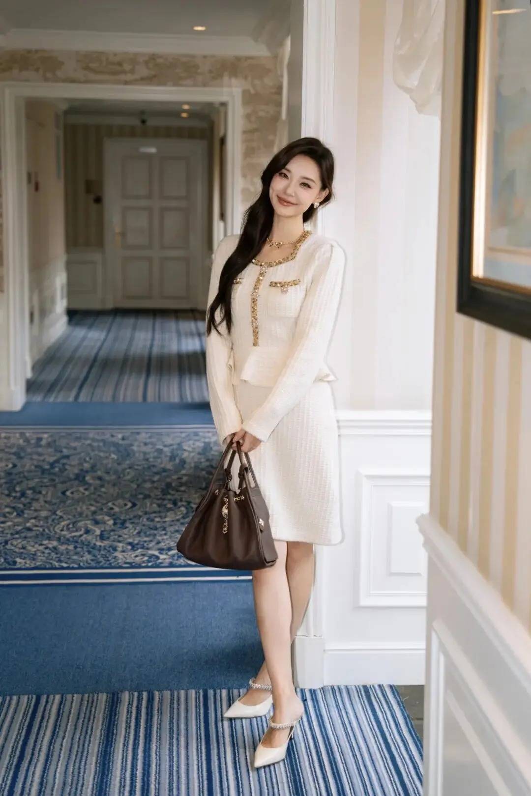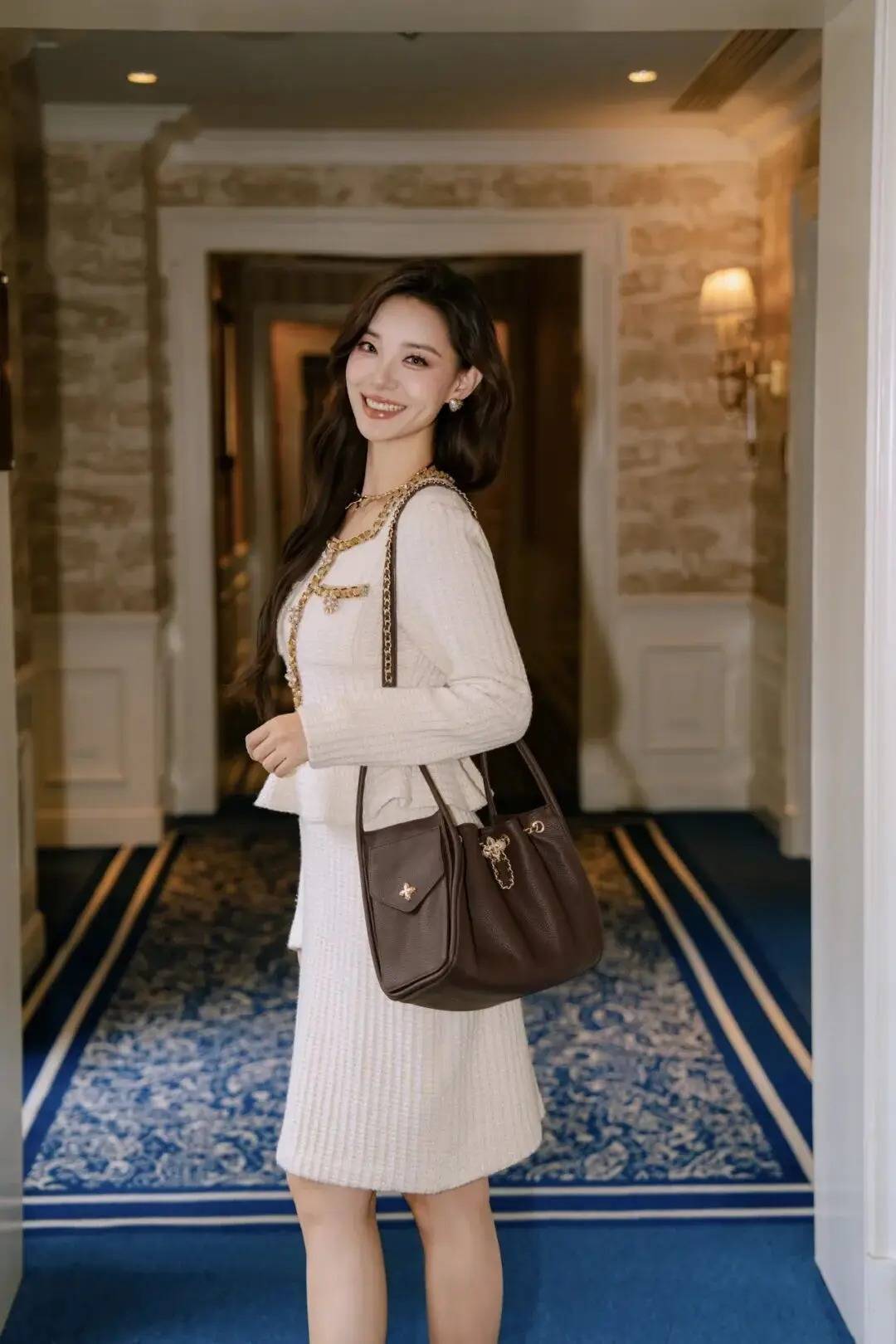 人物侧身站在廊道里,一手轻拎包带,姿态松弛不紧绷,既衬出穿搭的精致感,又借复古空间的氛围消解摆拍感。身体微转,长发自然垂落的细节让画面更灵动,神态是舒展的笑意,不用刻意凹造型,把日常的优雅随性揉进动作里,轻松拍出有质感的都市精致氛围