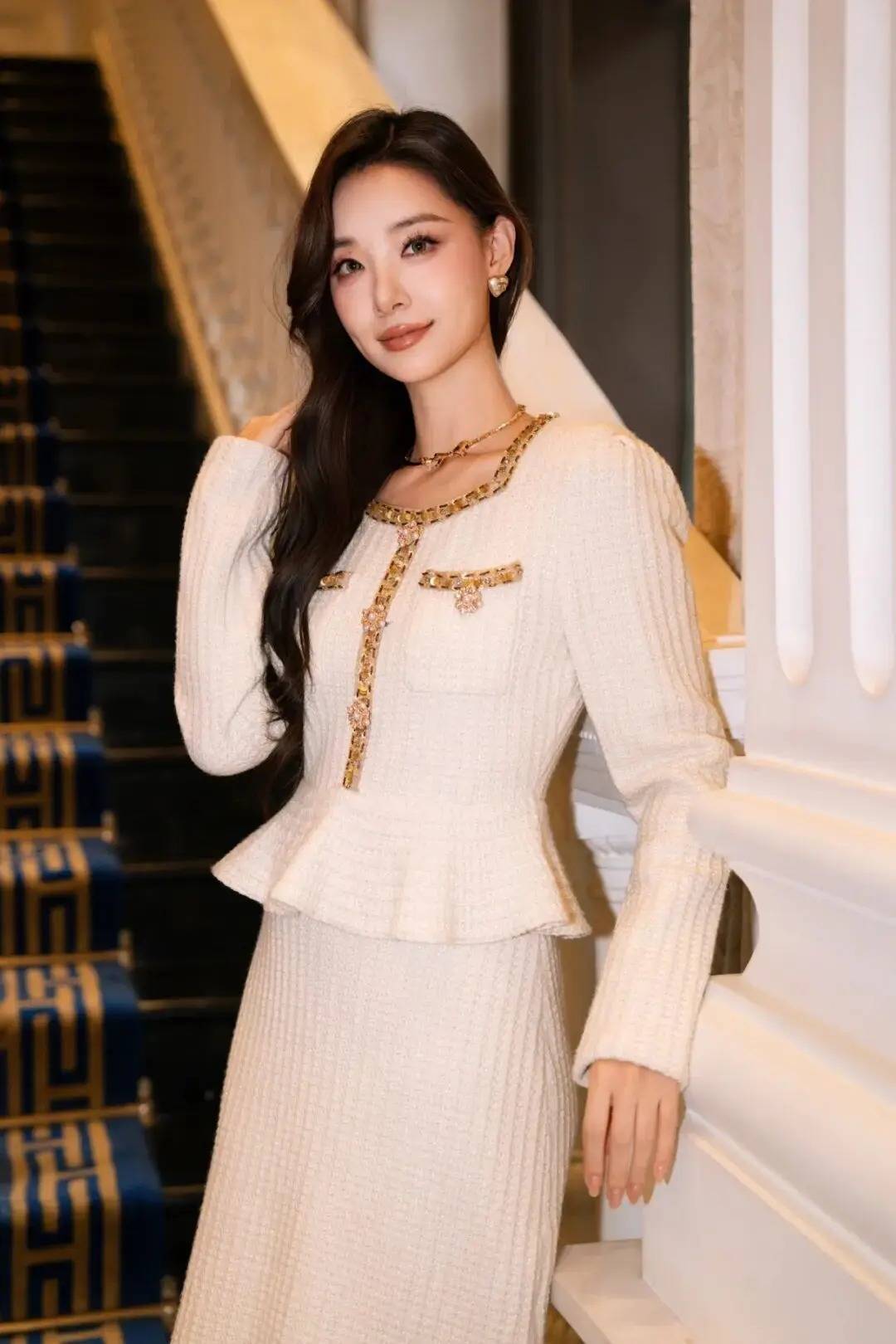 人物轻倚楼梯扶手,一手自然撩动长发,姿态松弛又灵动,既衬出穿搭的精致细节,又借华丽空间的氛围消解摆拍感。身体微侧,肩颈线条舒展柔和,神态带点慵懒笑意,不用刻意凹造型,把日常的优雅随性揉进动作里,轻松拍出有格调的精致氛围